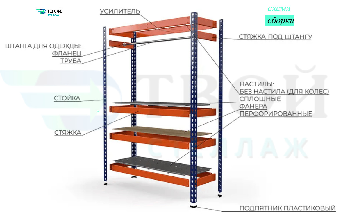 Стеллажи покрыты порошково-полимерной краской (синие стойки, оранжевые стяжки).
